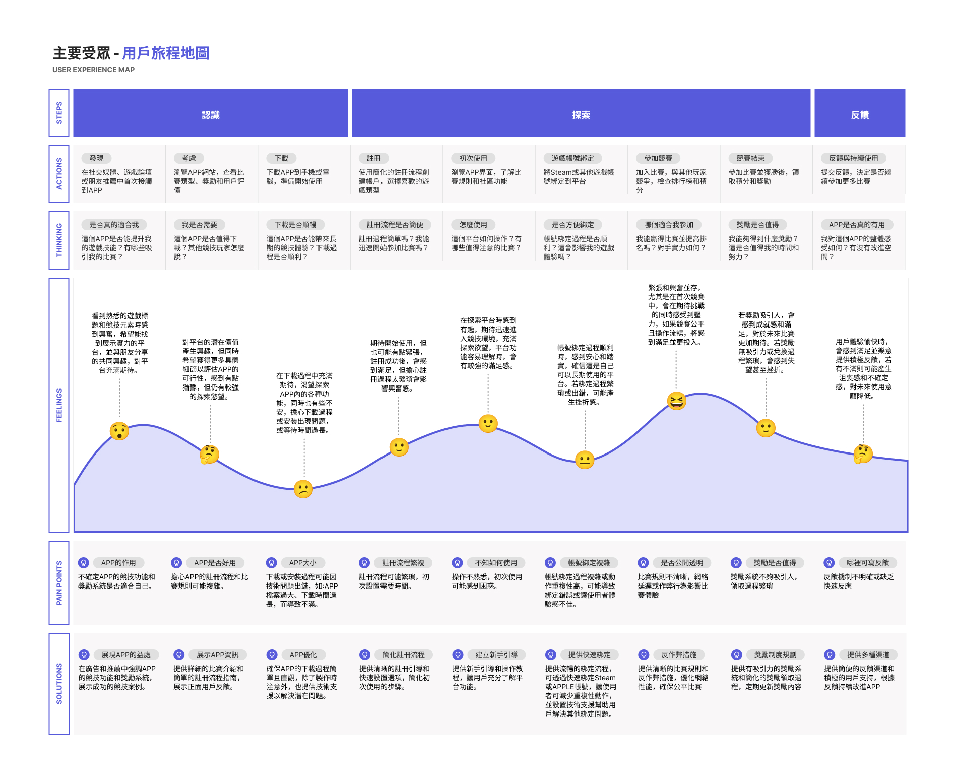 在用戶旅程的部分則專注於主要受眾,並在APP的探索階段中可發現以下思考點: