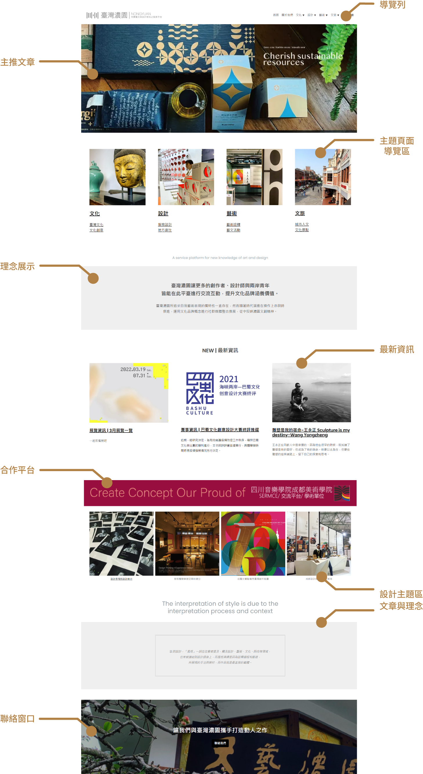 經過對其他網站的分析發現網站架構相當重要,而臺灣濃園原先僅分為五大核心區塊,包括「文化」、「設計」、「藝術」及「設計競賽」,所有文章內容皆由臺灣跟成都兩方相互對應組成,因此除了依需求增加新主題區外,也計畫將各主題分為相應兩區塊,當每個區塊清晰明了,可使用戶可以更方便地找到感興趣的內容,並提升他們的用戶體驗。